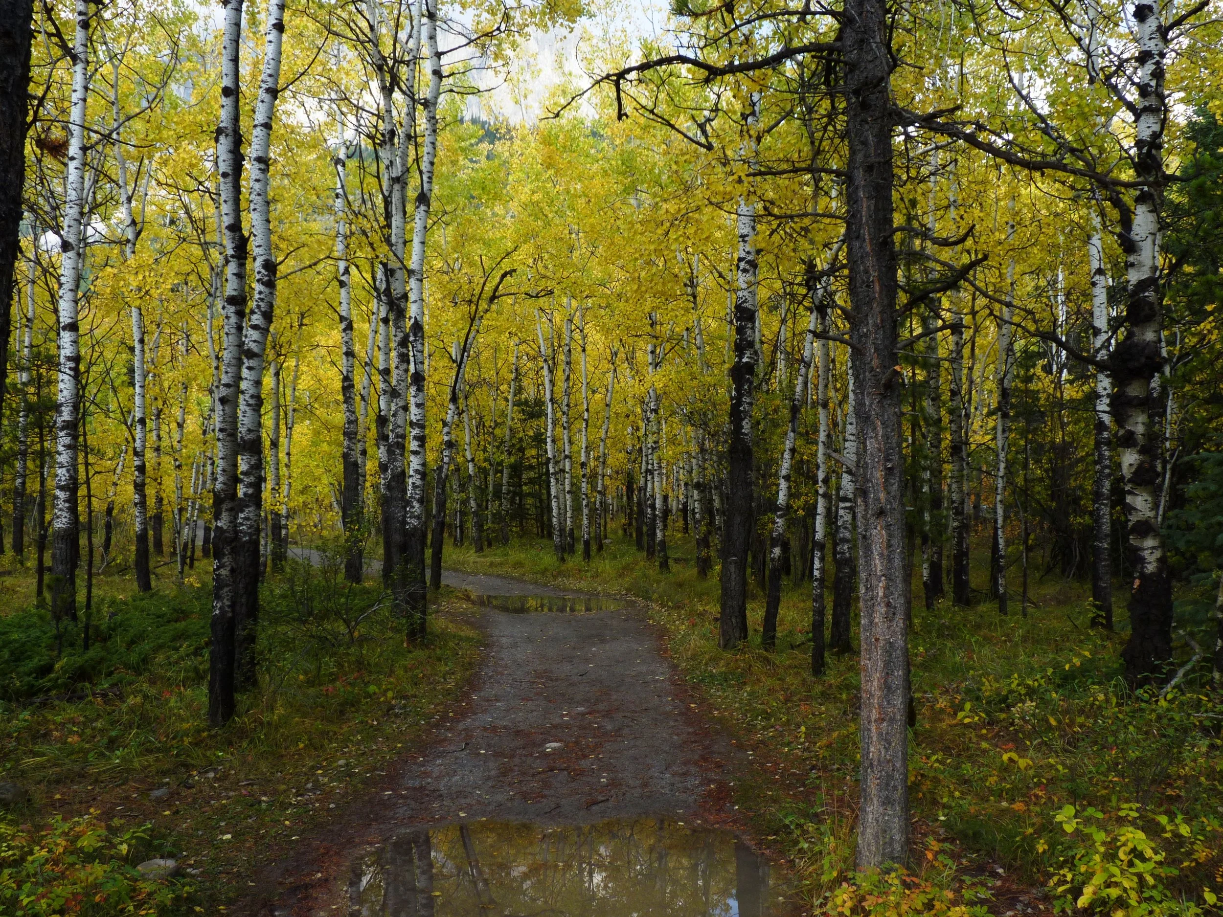 Like many places, fall in the Canadian Rockies is a magical vista of brilliant yellows, subtle reds, and the ever-green conifers. High in the alpine, in late September, the larch trees turn yellow, then orange as the needles start to fall in preparation for the snowy winters. Low in the Bow Valley, usually on south slopes, the aspen trees also turn brilliant yellow. It can be dazzling to walk through such a forest on a sunny day! To top it off, literally, the mountain peaks usually start to gather a frosting of early snows.