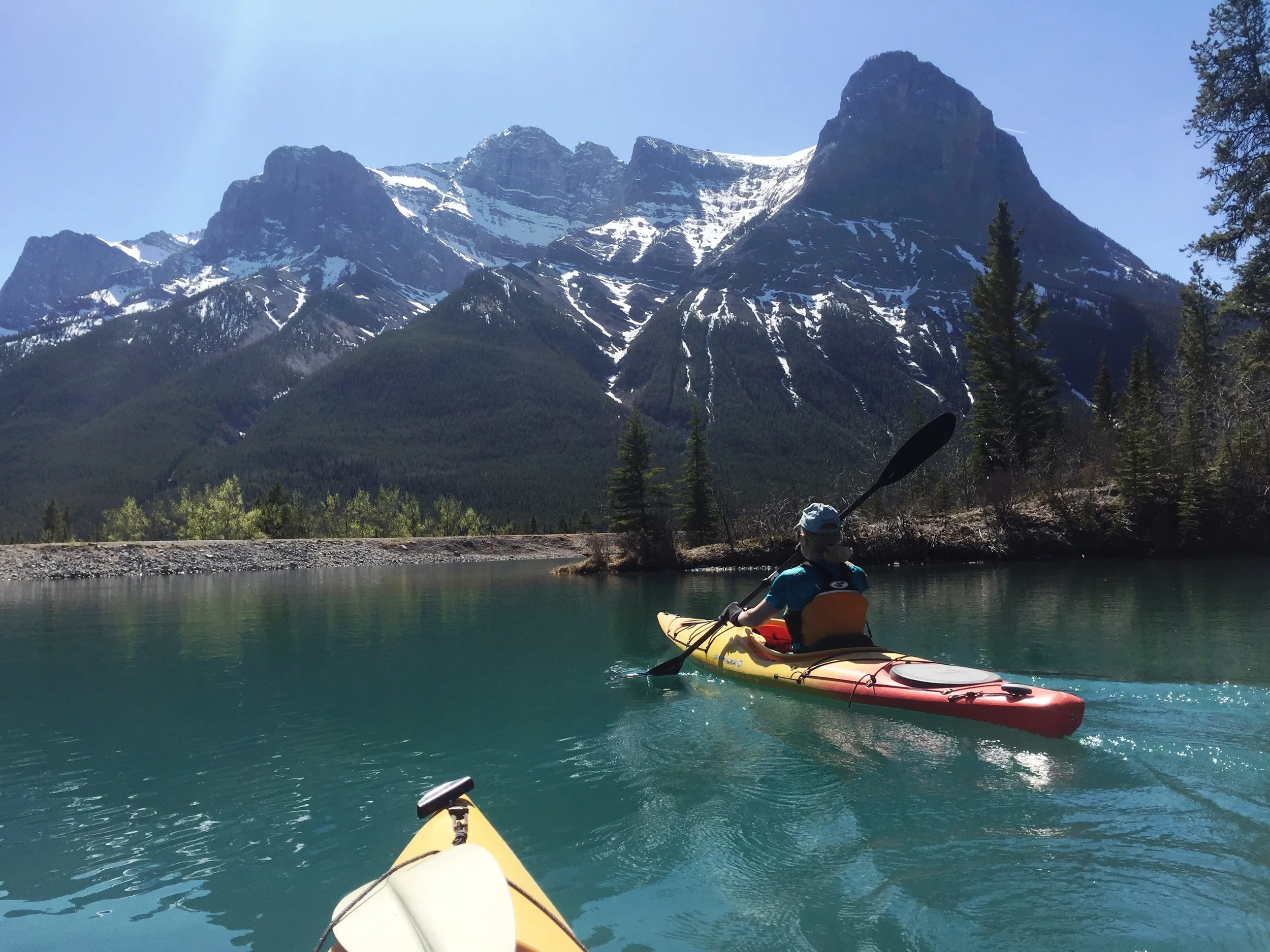 /Summer in April! The weather continues to be dry and very warm. Around Canmore, we've already been mountain biking, road biking, hiking, and today - kayaking! Likely the earliest we've ever pulled out the 'yaks for a paddle under bluebird skies, and not a breeze. Four minutes up the road from Grandview Chalet B&B is a reservoir that supplies half of Canmore's water supply. If you follow the shoreline around, it's about 5.5 km.